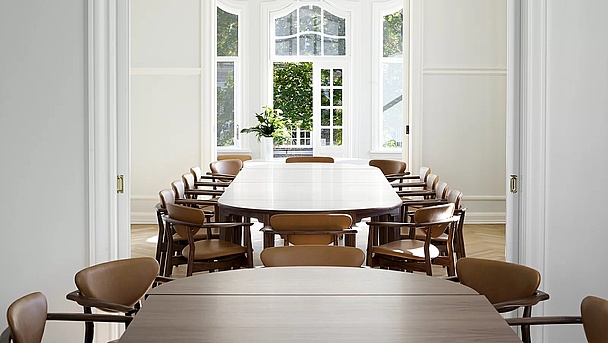 At Louisehøj, oval and round tables are both an option. Enjoy a welcome drink in the beautiful and unique wine cellar of the villa, or on the western terrace. After-dinner coffee and brandy are served in the old study, of course.