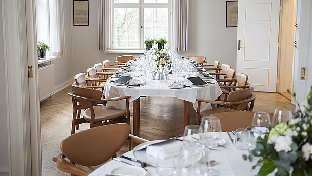På Louisehøj er der mulighed for både at dække op ved ovale samt runde borde. Der dækkes op med smukke duge og servietter designet af Arne Jacobsen og fremstillet hos Georg Jensen Damask i Kolding.